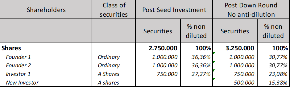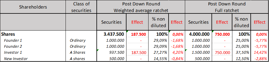 Below you will find an example visualizing the consequences of a down round (€ 250.000 invested at € 0,50 / share) occurring after a seed investment round (€ 750.000 invested at € 1 per share) with/without anti-dilution protection, including the difference between a full ratchet and a weighted ratchet approach.