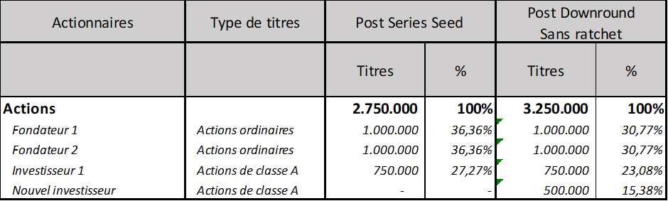 Comme la table de capitalisation est modélisé après un seed investment round, les actions du fondateur ne sont pas prises en compte dans les calculs. De plus, par souci de simplicité, l’exemple n’illustre aucune différence entre un narrow based weighted average ratchet et un broad based weighted average ratchet (ce dernier étant rarement utilisé dans notre pratique).