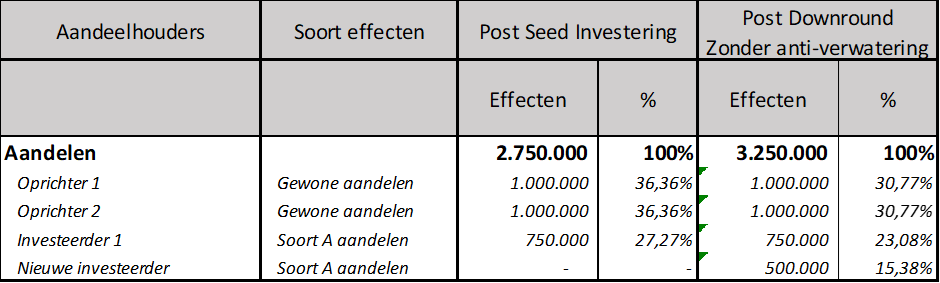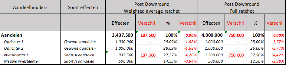 Hieronder vind je een voorbeeld dat de gevolgen weergeeft van een downround (€ 250.000 geïnvesteerd tegen € 0,50 / aandeel) die plaatsvindt na een seed investeringsronde (€ 750.000 geïnvesteerd tegen € 1 per aandeel) met/zonder anti-verwateringsbescherming, inclusief het verschil tussen een full ratchet en een weighted average ratchet.